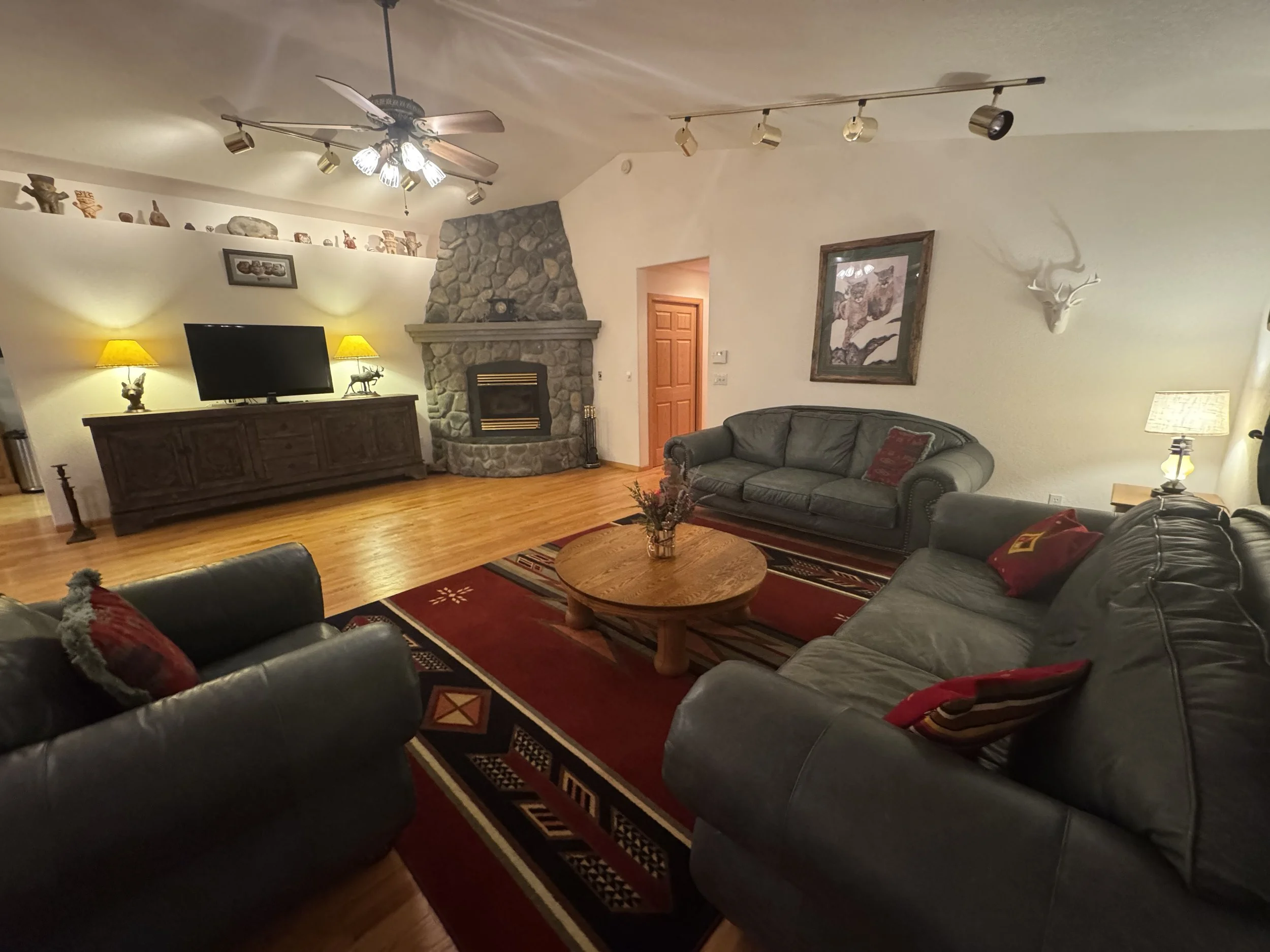 The main house is a 5,000 square foot, five bedroom, four bathroom mountain retreat, complete with 2000-volume library and office, expansive billiard room featuring a lovingly handcrafted saloon bar, fully stocked kitchen with two ranges, a formal dining area, second-story wrap-around porch and a great room with two formal seating areas and a floor to ceiling stone fireplace.